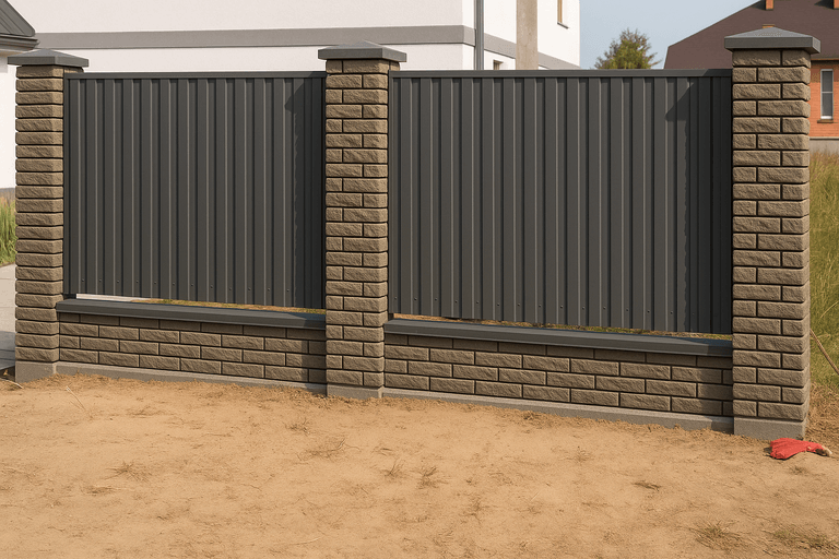 На финальном этапе устанавливаются колпаки, козырьки и декоративные вставки, если они предусмотрены проектом. Также возможна интеграция калиток, ворот и освещения.